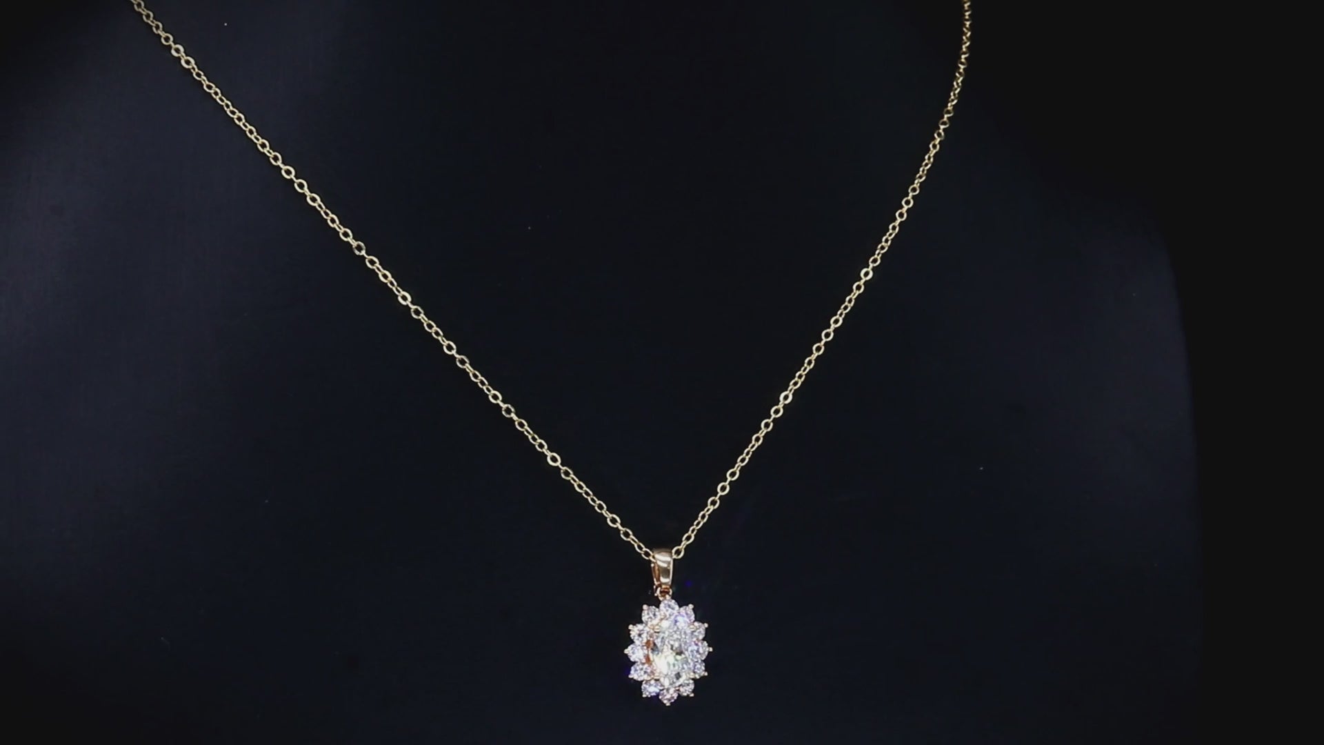 Oval Lab Diamond Pendant blossoms with a oval shaped lab diamond at its core, elongated facets capturing and refracting pure crystalline light. Encircled by a constellation of round lab diamonds set within hand-sculpted golden petals, the pendant creates a symmetrical floral motif. Classical elegance.