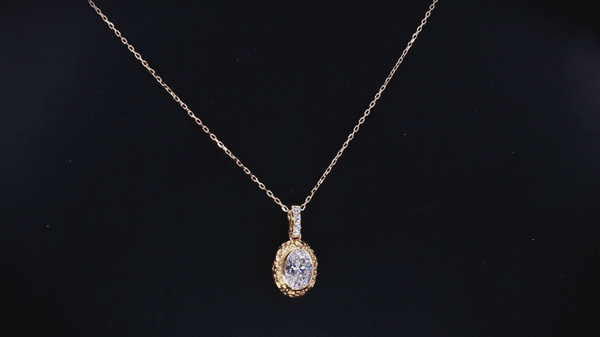 The 18K Yellow Gold Vintage Oval Pendant centers a bright oval-cut lab diamond, elegantly framed by a hand-textured 18K yellow gold bezel with delicate milgrain edging. The pendant features three round lab diamonds accents. The diamond’s scintillation contrasts with the warm, hammered gold surface. Designed as a pendant-only piece, it celebrates artisanal craftsmanship through its organic texture and ethical brilliance — perfect for those who value timeless elegance with a touch of vintage inspiration.